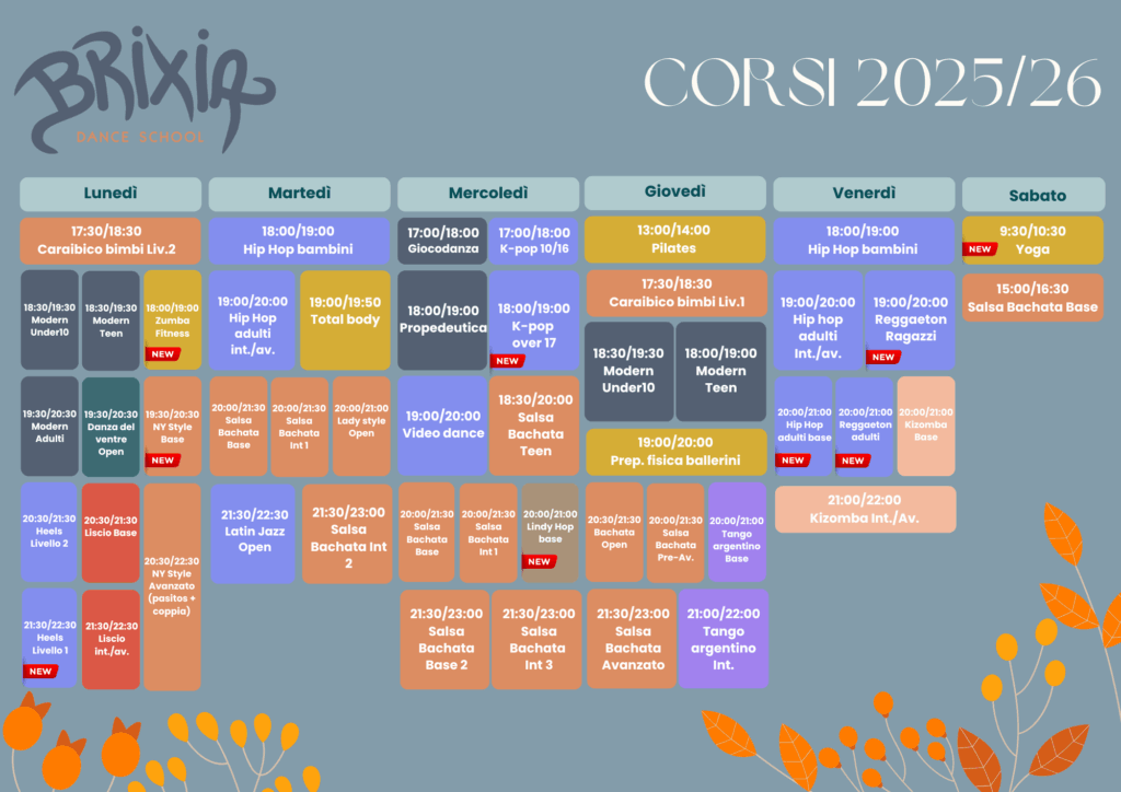 Visualizza qui sotto il planning dei corsi di ballo a Brescia presso la Brixia Dance School per l’anno 2025/2026. Puoi anche salvarlo sul tuo smartphone!